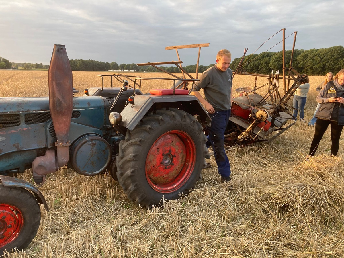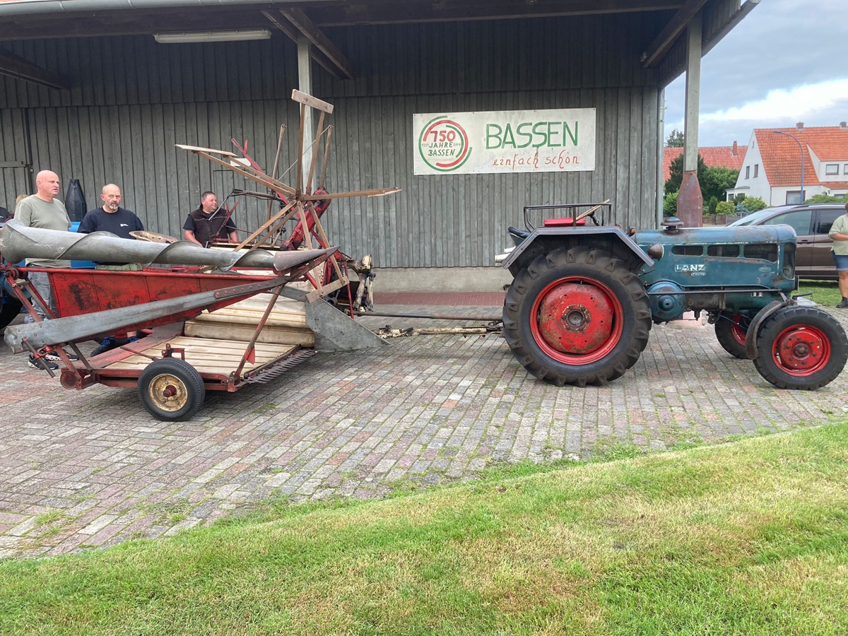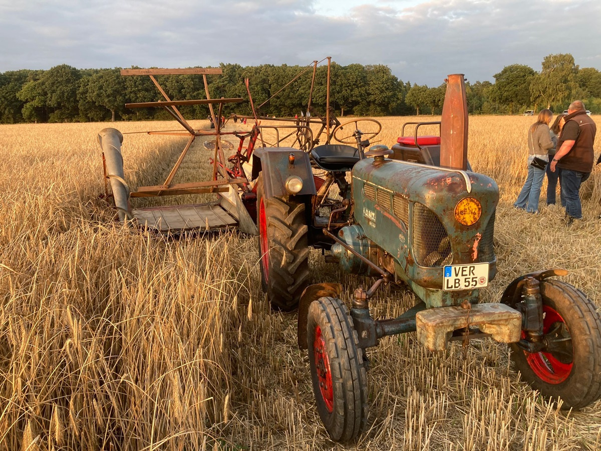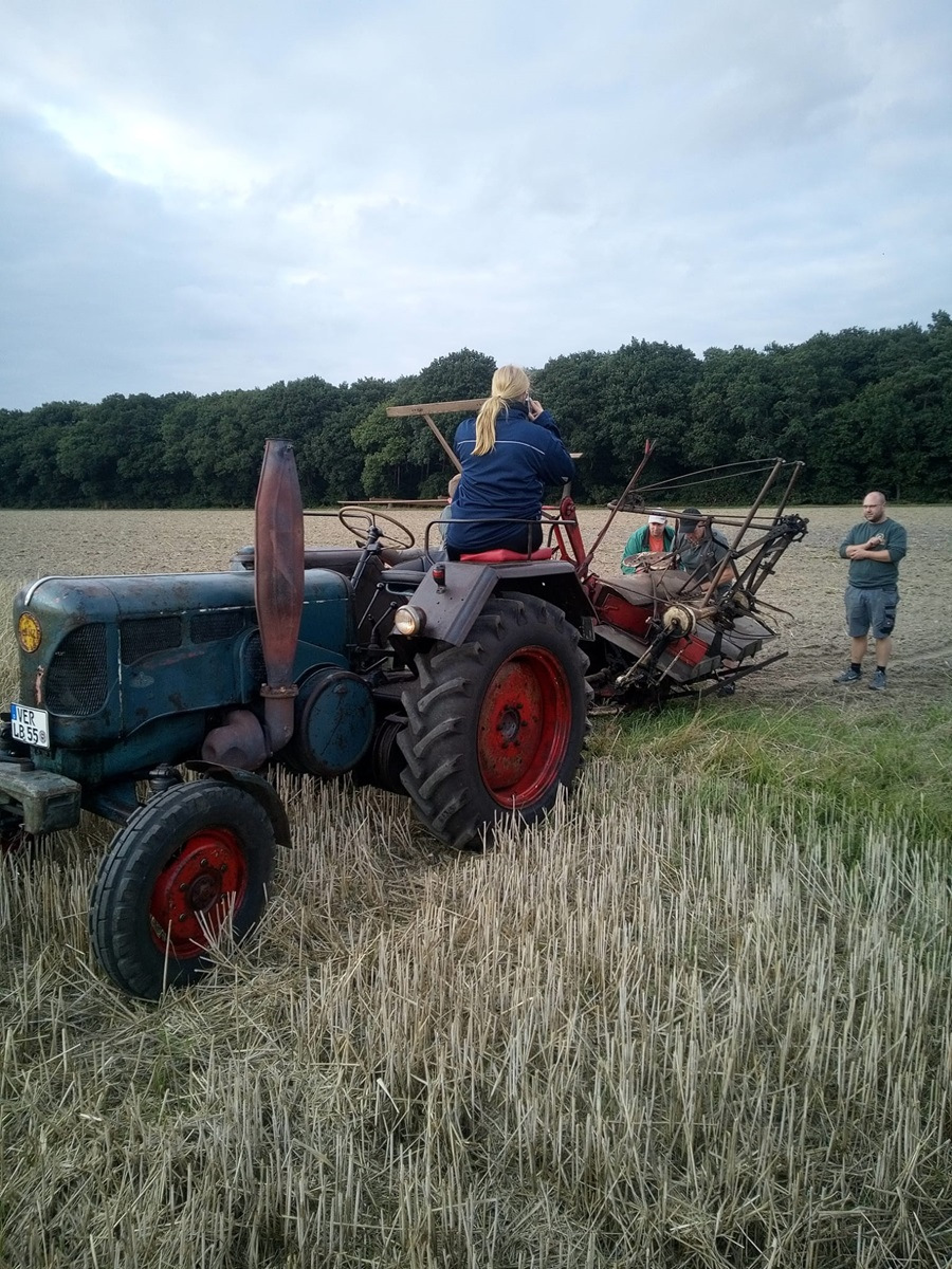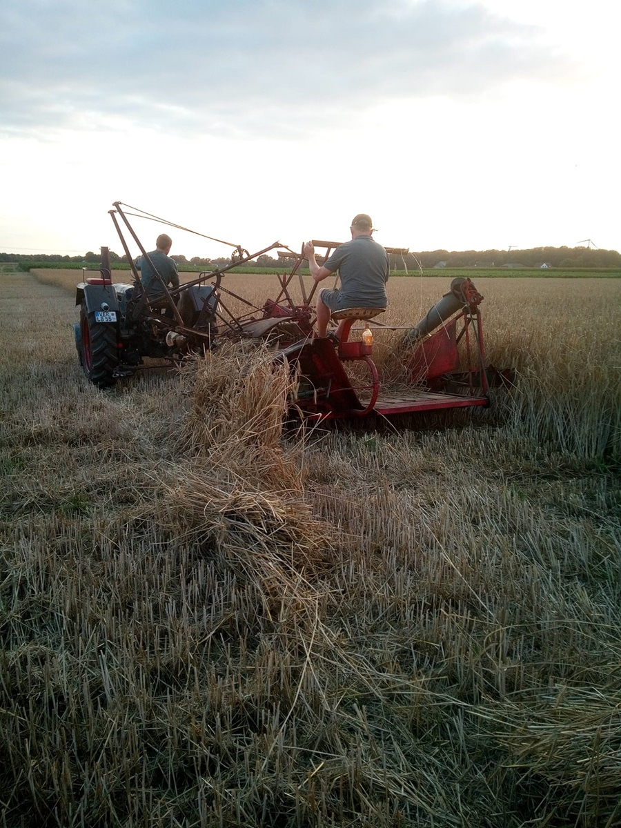 Gestern Abend war um 19:30 Uhr treffen auf dem Hof von Blocks Huus. Nachdem der Mähbinder an der Zugmaschine angekoppelt war, ging die Fahrt quer durch Bassen über die Borsteler Straße und Fuhrenkamp in die Nähe von Fricke’s Gartencenter. Auf einem Feld dahinter stellt dieses Jahr Carsten Mattfeld sein Korn für die Erntekrone zur Verfügung. Gemeinsam wurde der Mähbinder aufgebaut und eingerichtet. Danach wurden einige Bahnen mit dem Mähbinder gefahren, um genügend Garben für unsere Erntekrone zu binden. Anschließend unterstützten die freiwilligen Helferinnen und Helfer beim Aufladen auf den Anhänger.