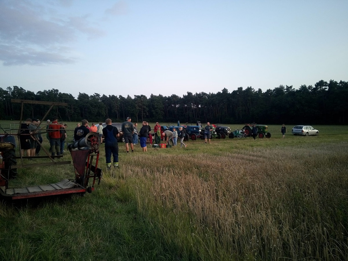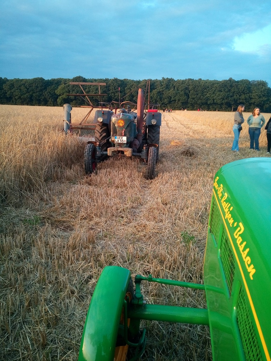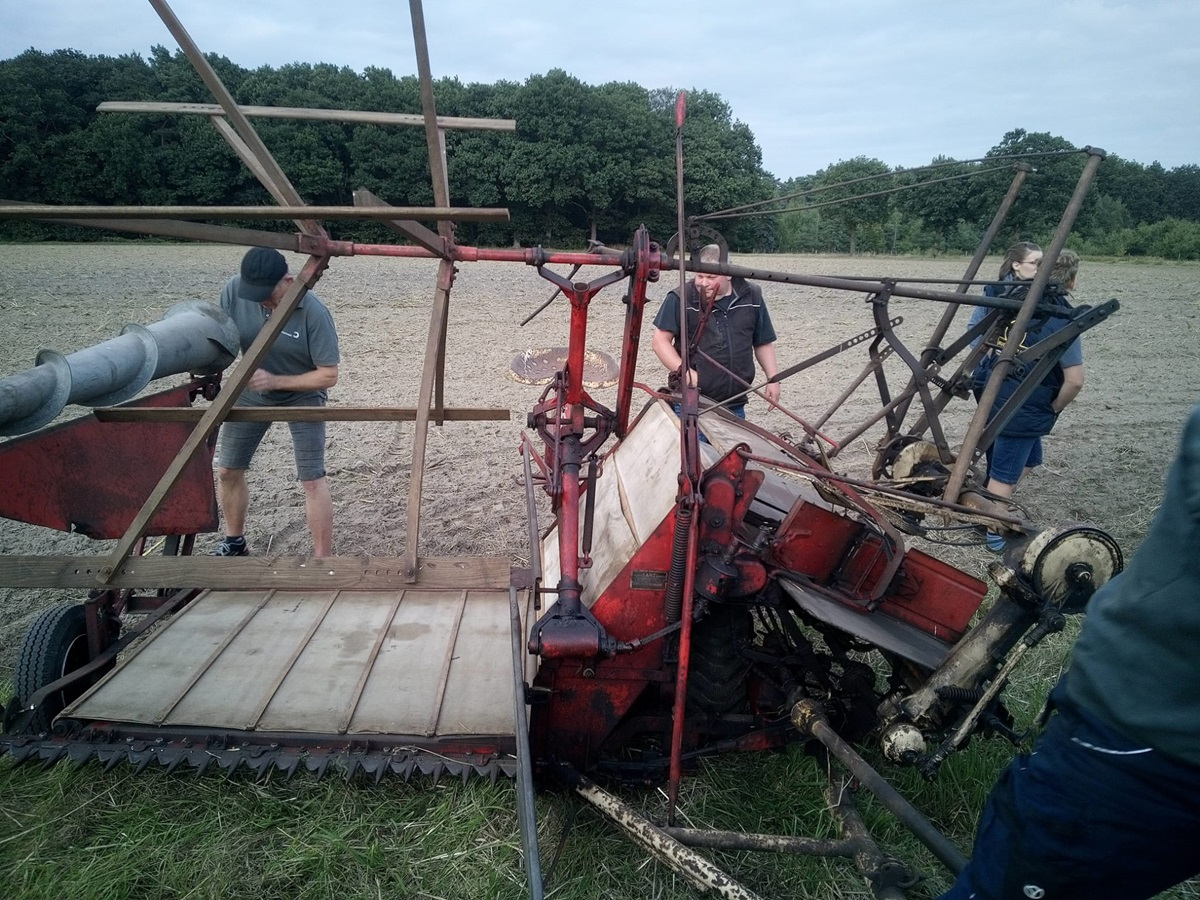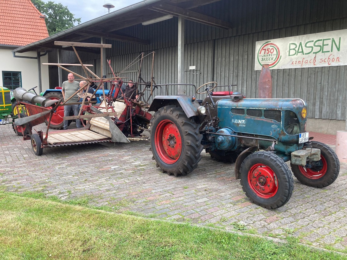 Gestern Abend war um 19:30 Uhr treffen auf dem Hof von Blocks Huus. Nachdem der Mähbinder an der Zugmaschine angekoppelt war, ging die Fahrt quer durch Bassen über die Borsteler Straße und Fuhrenkamp in die Nähe von Fricke’s Gartencenter. Auf einem Feld dahinter stellt dieses Jahr Carsten Mattfeld sein Korn für die Erntekrone zur Verfügung. Gemeinsam wurde der Mähbinder aufgebaut und eingerichtet. Danach wurden einige Bahnen mit dem Mähbinder gefahren, um genügend Garben für unsere Erntekrone zu binden. Anschließend unterstützten die freiwilligen Helferinnen und Helfer beim Aufladen auf den Anhänger.