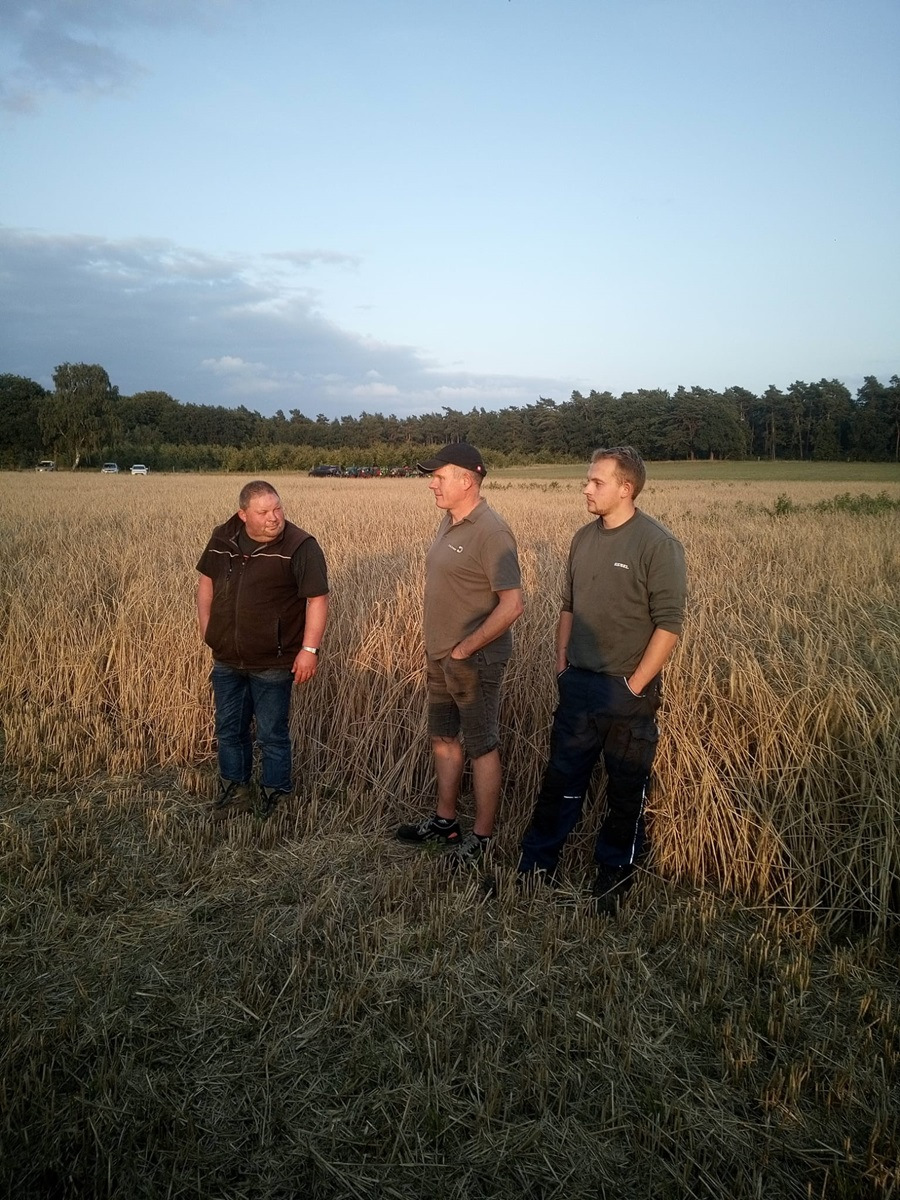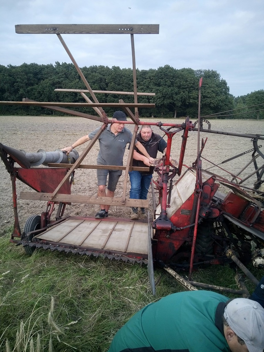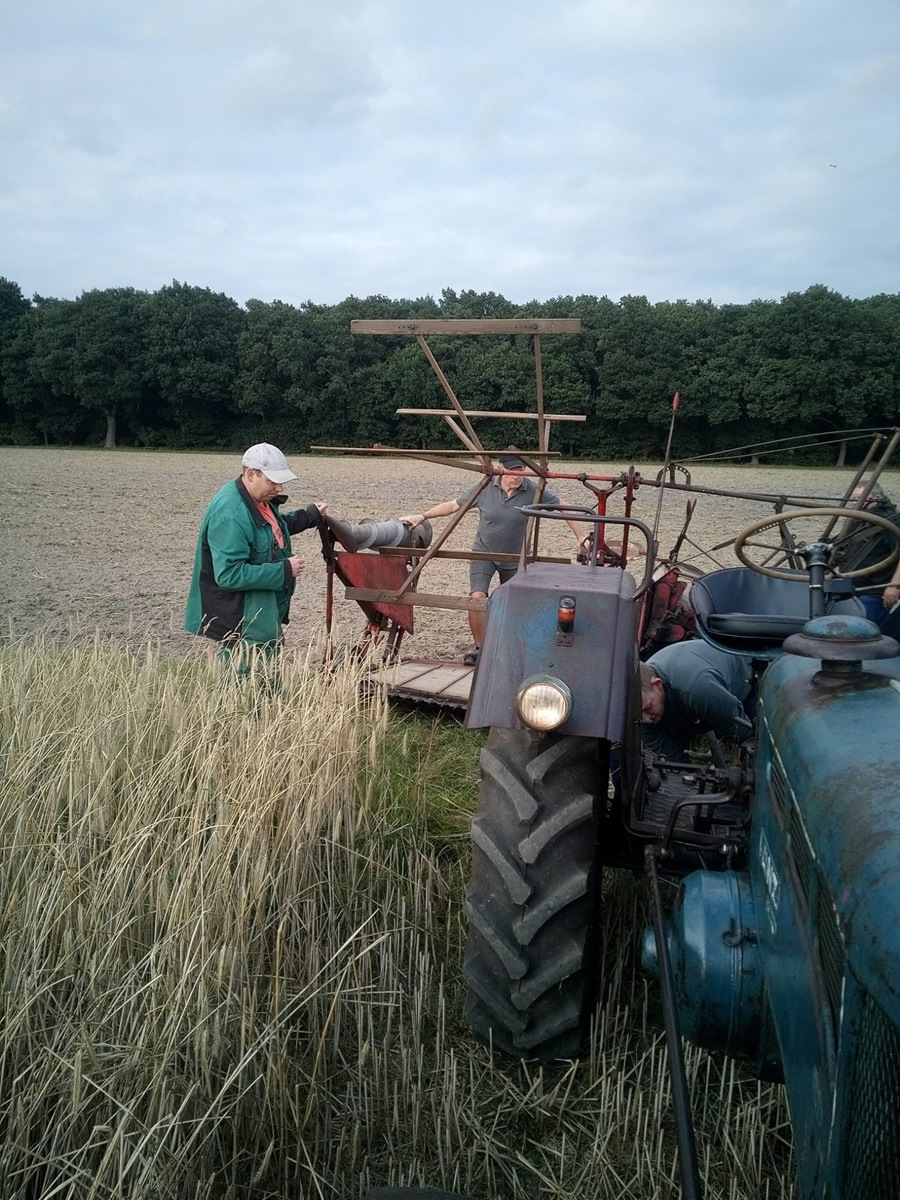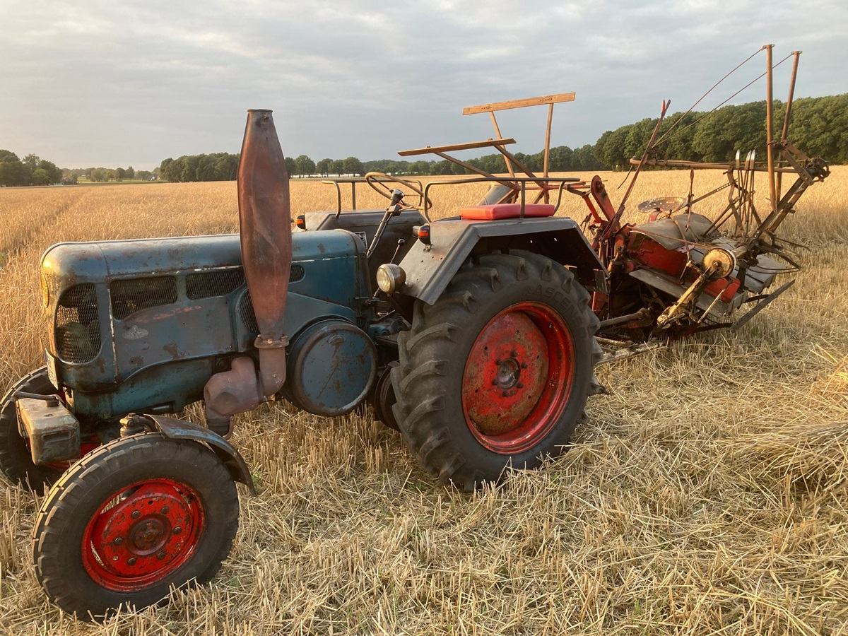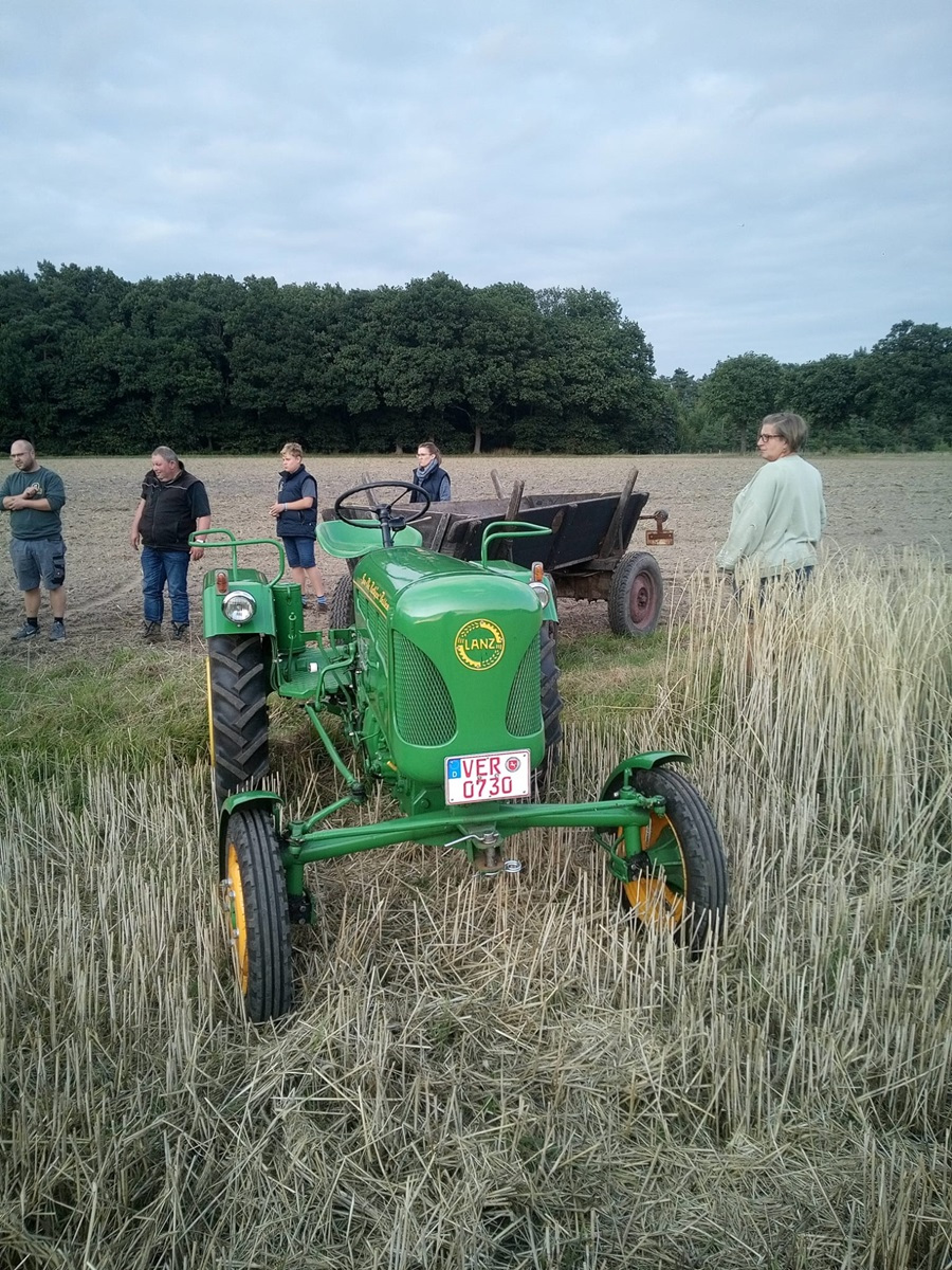 Gestern Abend war um 19:30 Uhr treffen auf dem Hof von Blocks Huus. Nachdem der Mähbinder an der Zugmaschine angekoppelt war, ging die Fahrt quer durch Bassen über die Borsteler Straße und Fuhrenkamp in die Nähe von Fricke’s Gartencenter. Auf einem Feld dahinter stellt dieses Jahr Carsten Mattfeld sein Korn für die Erntekrone zur Verfügung. Gemeinsam wurde der Mähbinder aufgebaut und eingerichtet. Danach wurden einige Bahnen mit dem Mähbinder gefahren, um genügend Garben für unsere Erntekrone zu binden. Anschließend unterstützten die freiwilligen Helferinnen und Helfer beim Aufladen auf den Anhänger.